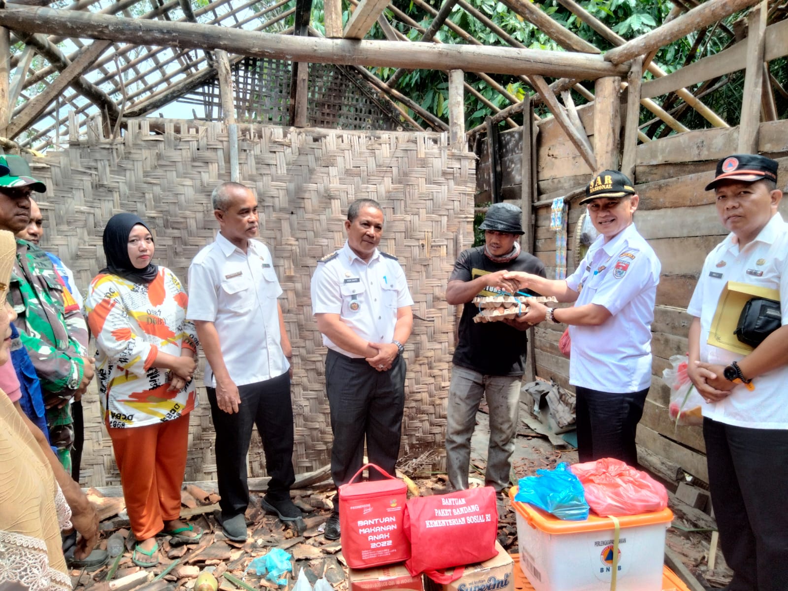 Didampingi Camat Panca Jaya Aida Sakti, dan Kabid Perlindungan dan Jaminan Sosial Dinsos Mesuji Iswantoro, Kepala BPBD Mesuji Sunardi Nyerupa. SE. mewakili Penjabat Bupati Mesuji Drs.Sulpakar.MM., menyerahkan bantuan berupa beras, mie instan, peralatan dapur,box peralatan kebersihan, sembako dan 2 Kodi Asbes.
