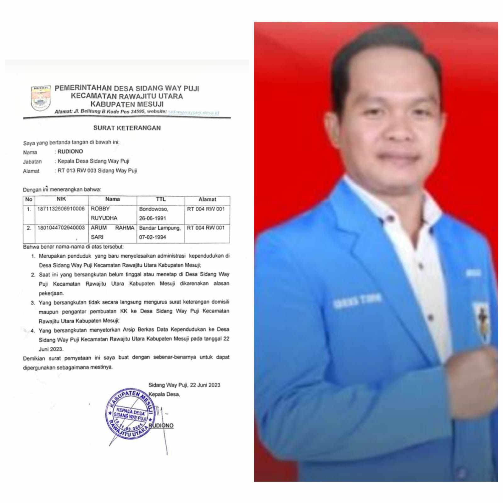 Terpisah Kepala Desa Way Puji RUDIONO mengatakan dengan tegas berdasarkan KK ROBBY RUYUDHA lahir Bondowoso,