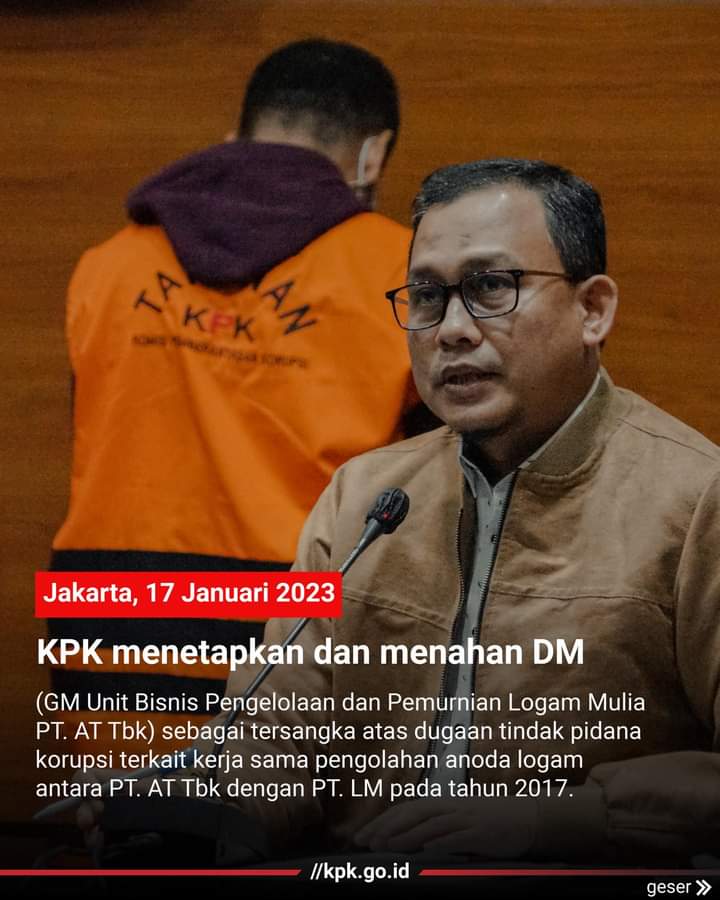 Komisi Pembrantas Korupsi (KPK) menetapkan dan menahan DM (GM Unit Bisnis Pengelolaan dan Pemurnian Logam Mulia PT. AT Tbk) sebagai tersangka atas dugaan tindak pidana korupsi terkait kerja sama pengolahan anoda logam antara PT. AT Tbk dengan PT. LM pada tahun 2017, Kamis (17/01/2023).