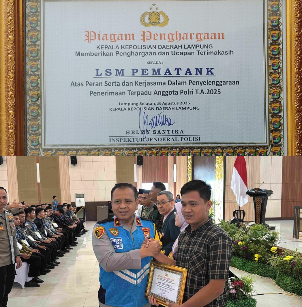 Bandar Lampung-Lembaga Swadaya Masyarakat pergerakan Masyarakat analisis kebijakan (LSM Pematank) menerima penghargaan atas peran serta dan kerjasama dalam penyelenggaraan penerimaan terpadu anggota polri tahun 2025 oleh inspektur jenderal polisi Helmy Santika Polda Lampung.